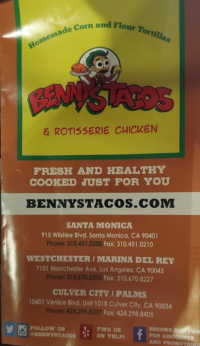 Introducing Benny's Tacos & Rotisserie Chicken in Santa Monica, a vibrant eatery that effortlessly combines homely charm with delicious flavors. Nestled on 915 Wilshire Blvd, this cozy spot beckons taco enthusiasts and families alike. The extensive menu showcases the best of Mexican-American cuisine, featuring everything from massive California burritos bursting with carnitas, to the standout barbacoa tacos praised for their rich, savory depth.